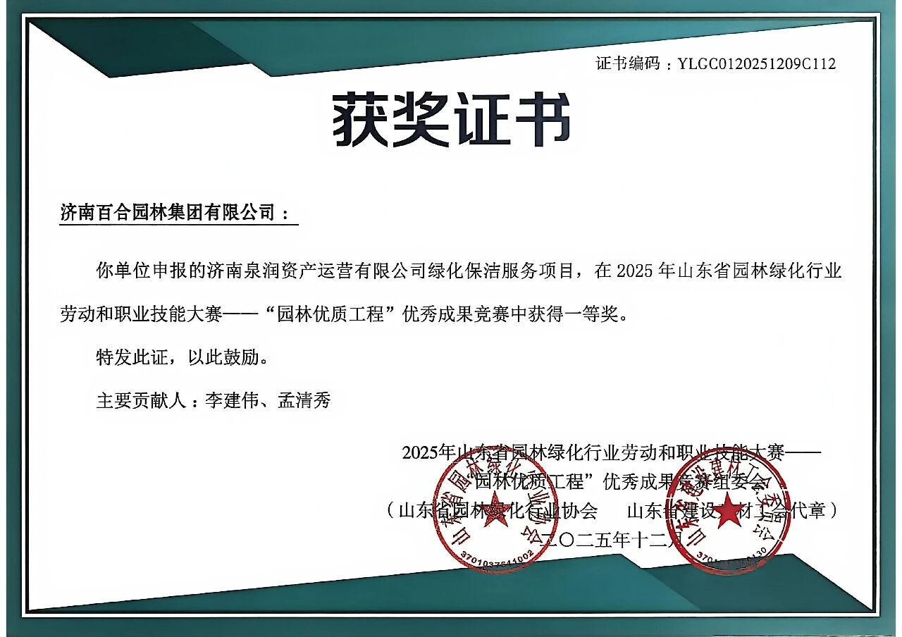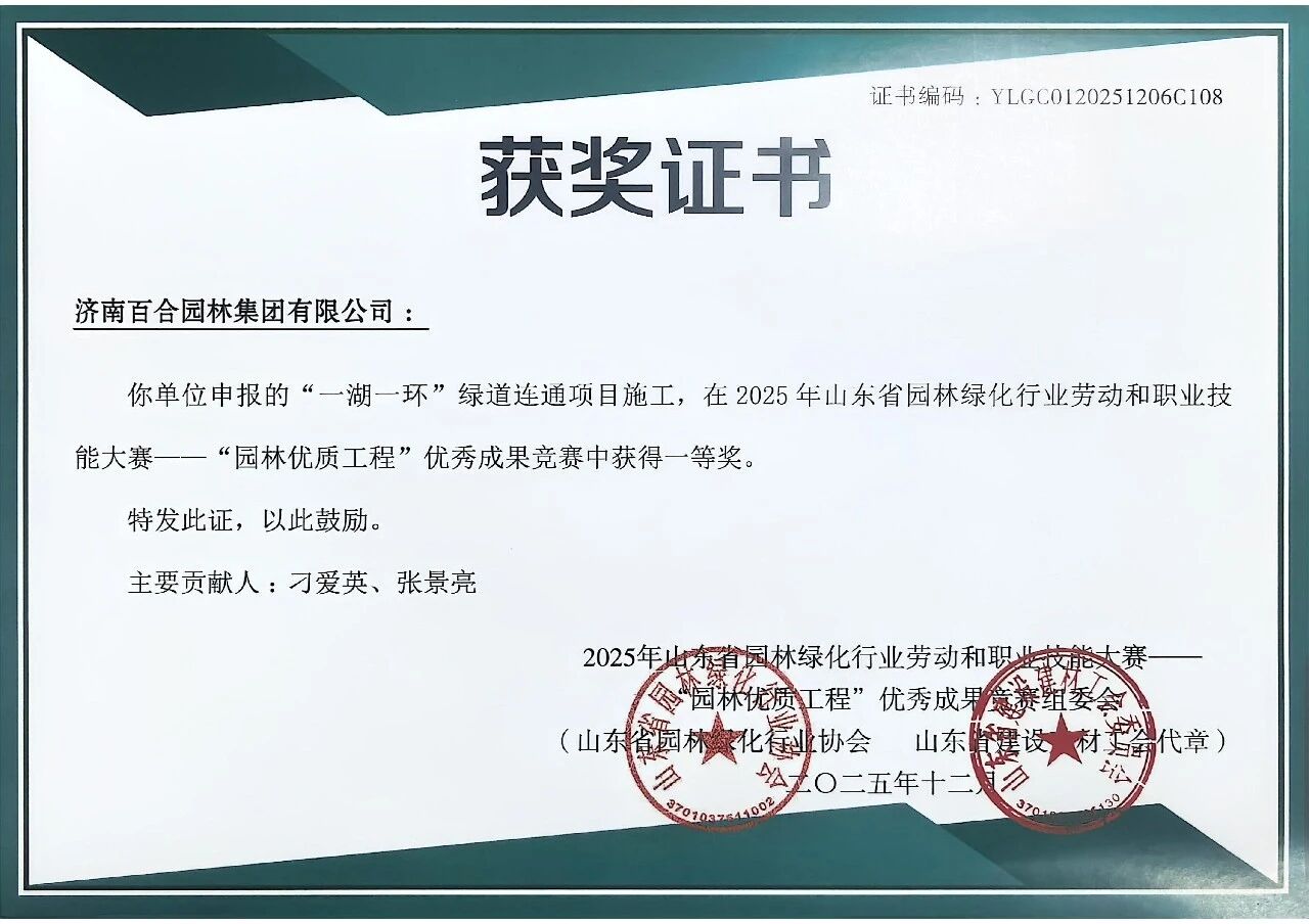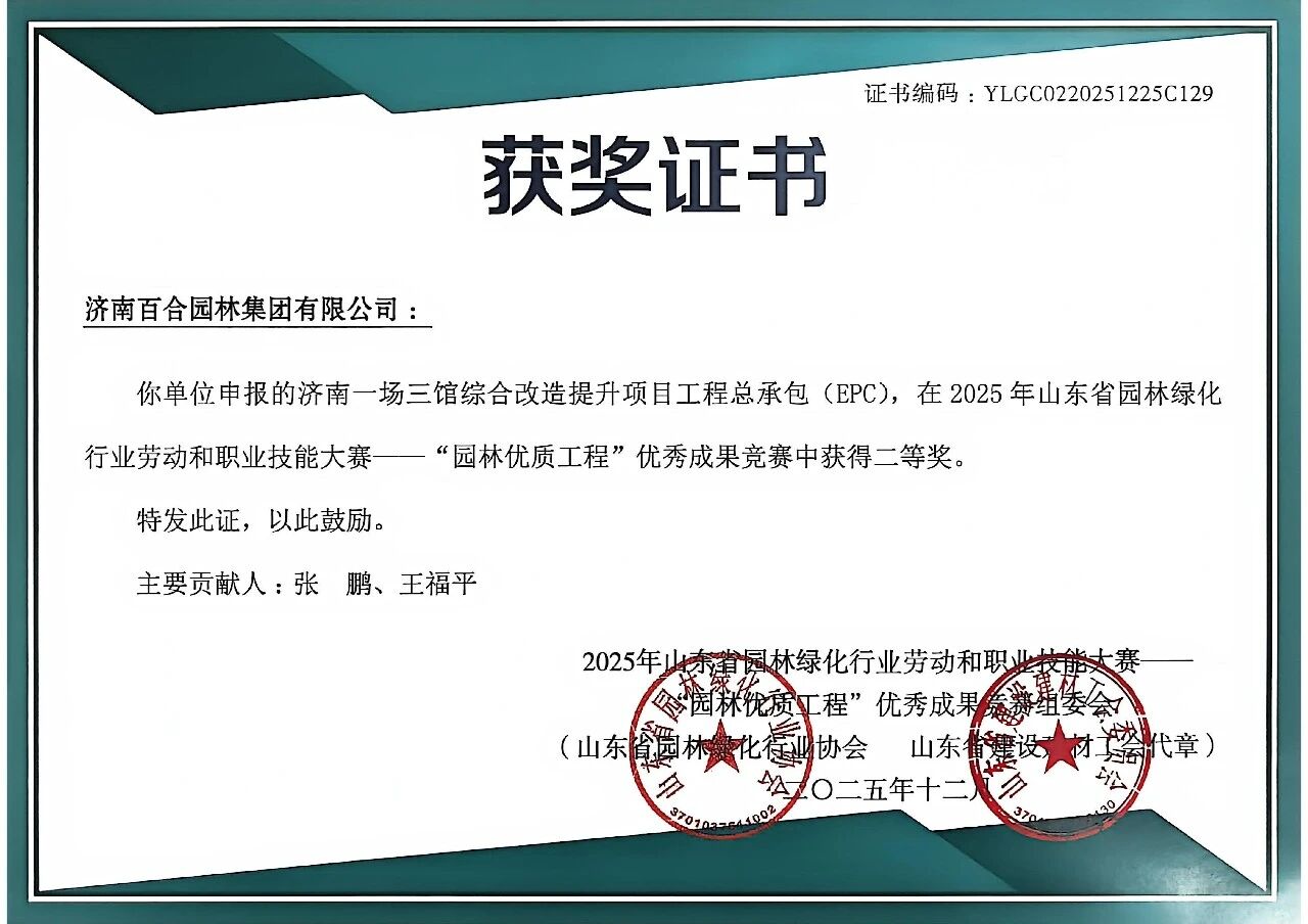 近日,2025年山東省園林綠化行業(yè)勞動和職業(yè)技能大賽——“園林優(yōu)質(zhì)工程”優(yōu)秀成果競賽活動結(jié)果揭曉。濟(jì)南百合園林集團(tuán)有限公司憑借卓越的綜合實力與精湛的專業(yè)技藝榮獲多項榮譽(yù)。
