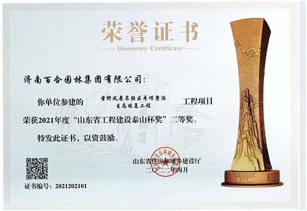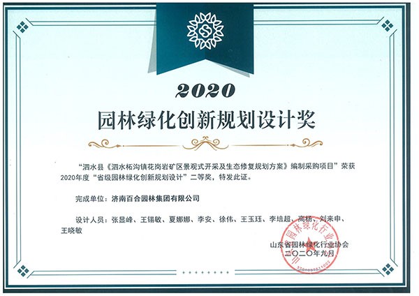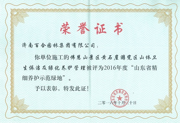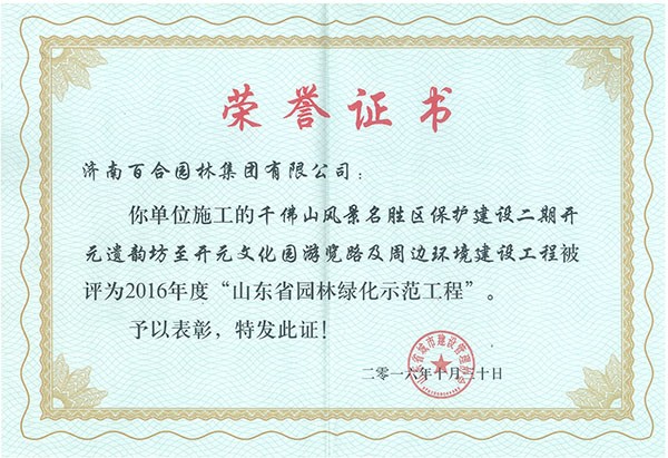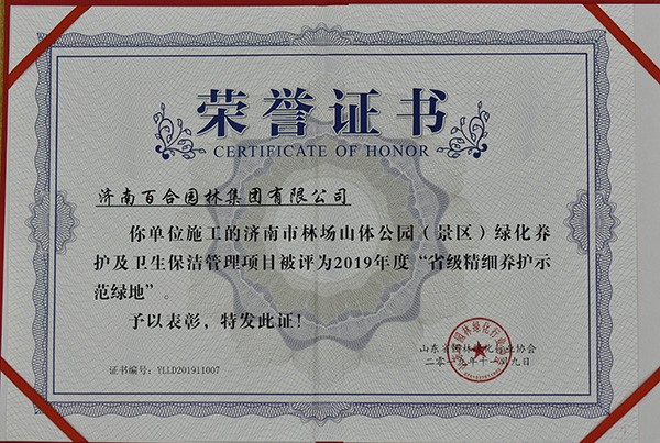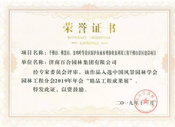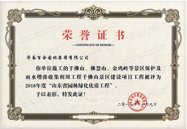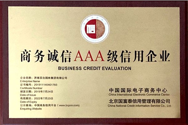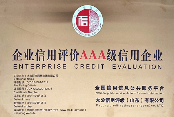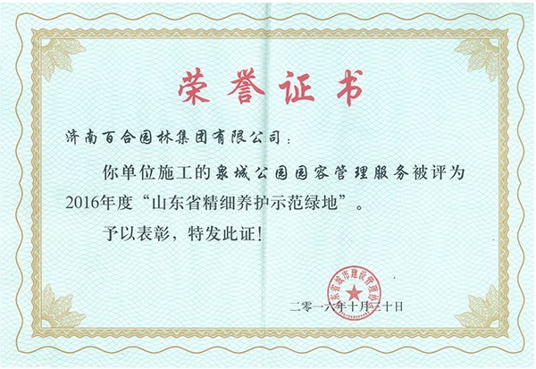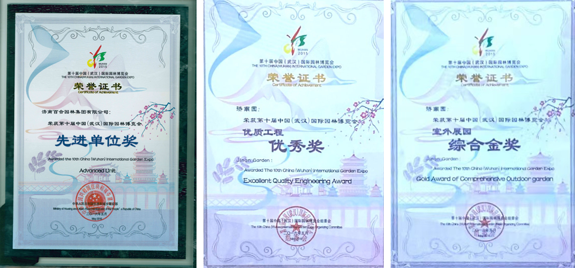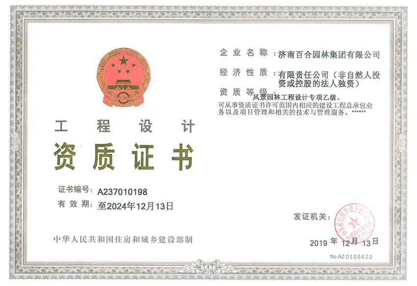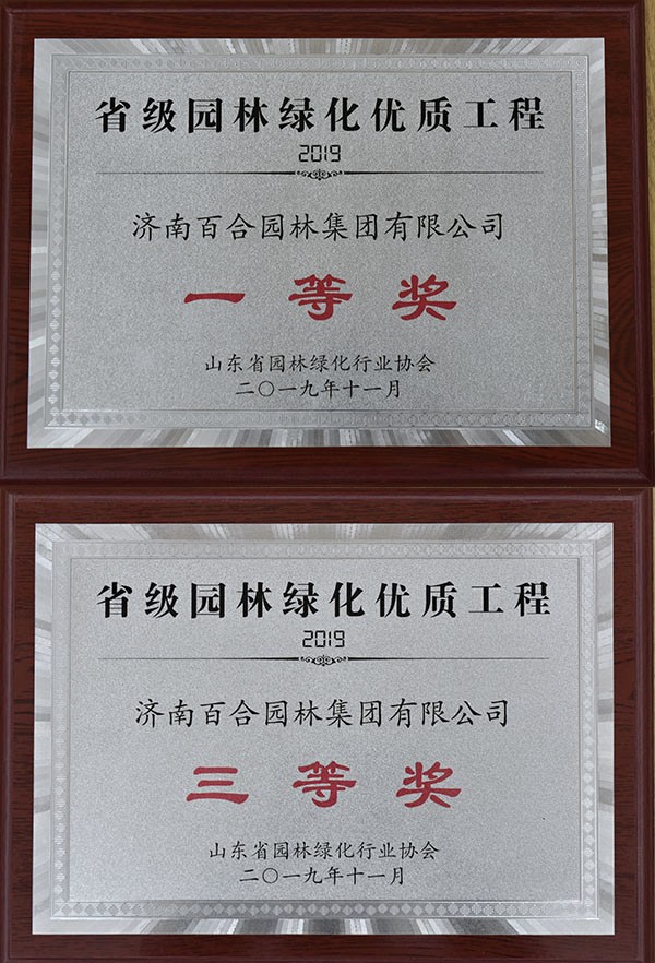 多年來,百合園林集團(tuán)堅(jiān)持“內(nèi)強(qiáng)素質(zhì),外塑形象”,以誠信求發(fā)展,擁有原國家園林綠化施工壹級資質(zhì)、風(fēng)景園林設(shè)計(jì)乙級資質(zhì)、花卉苗木進(jìn)出口經(jīng)營權(quán)、建筑和市政公用工程施工總承包叁級資質(zhì)、具備大型園林工程設(shè)計(jì)、施工和綠地養(yǎng)護(hù)管理能力。自成立以來,本著“建精品工程,樹百合形象”的宗旨,優(yōu)良的經(jīng)營業(yè)績、靈活的運(yùn)行機(jī)制、過硬的技術(shù)力量、誠信的管理模式使百合園林集團(tuán)被評為山東省“十大花卉企業(yè)”、山東省“種苗示范基地”,山東省“林木種苗先進(jìn)單位”。施工的工程先后獲得“魯班獎”、中國風(fēng)景園林學(xué)會優(yōu)秀園林綠化工程大金獎,省、市園林優(yōu)質(zhì)工程獎等多個獎項(xiàng),設(shè)計(jì)項(xiàng)目獲得多項(xiàng)“艾景獎”、中國人居典范景觀設(shè)計(jì)方案金獎,省市優(yōu)秀設(shè)計(jì)獎等獎項(xiàng)。集團(tuán)還先后獲得“五一勞動獎狀”,“中國風(fēng)景園林學(xué)會3A級會員單位”等多項(xiàng)榮譽(yù)稱號。