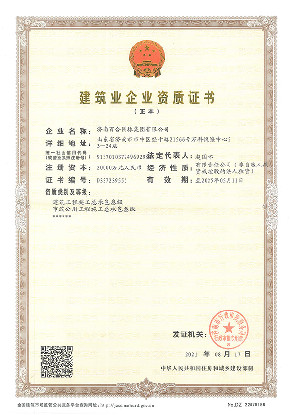 百合園林集團(tuán)擁有國家園林綠化施工壹級資質(zhì)、市政公用工程施工叁級資質(zhì),具備大型園林工程設(shè)計(jì)、施工和綠地養(yǎng)護(hù)管理能力。