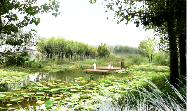 方案在保證現(xiàn)有水域面積的基礎(chǔ)上,盡可能增加水域總岸線的長度,加強邊際效應(yīng),通過小范圍地形改造營造各種類型灘地,盡可能使間歇性淹水生境的種類更加豐富,面積逐漸擴大。整理河道水系,溝通園區(qū)內(nèi)的各主要水域,豐富水域類型,活化生境,疏通生態(tài)廊道,使?jié)竦厣鷳B(tài)系統(tǒng)與周邊山體綠地農(nóng)田等生態(tài)系統(tǒng)連為一體,形成有利于各類動植物繁殖的水域生境。