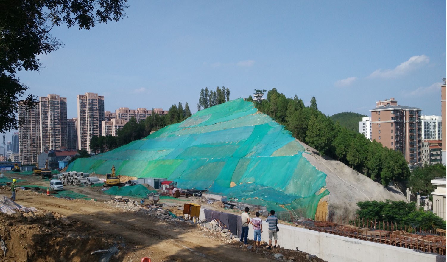 翠屏山工程邊坡位于濟(jì)南市二環(huán)東路沿線,千佛山風(fēng)景名勝區(qū)西臨,對重要道路地段的景觀有較大影響,同時(shí)也承擔(dān)了破損山體生態(tài)功能的需求。坡面為建設(shè)老虎山隧道,因隧道施工而形成的人工坡面,長137米,高29米,坡度39.6°,綠化面積3552平方米。原地形為三級(jí)平臺(tái),每級(jí)平臺(tái)寬約2米,由于雨水侵蝕,有部分土石滑落的現(xiàn)象。項(xiàng)目在坡面排險(xiǎn)的基礎(chǔ)上,采用生態(tài)袋、土工格室、植被毯等多修復(fù)方式結(jié)合的方法,選擇適宜的植物,對坡面進(jìn)行植被重建,最終修復(fù)成一個(gè)集穩(wěn)固邊坡、生態(tài)修復(fù)、保持水土、景觀綠化等多功能為一體的綜合性邊坡,呈現(xiàn)出具有自然性和生態(tài)性的綠化景觀。
